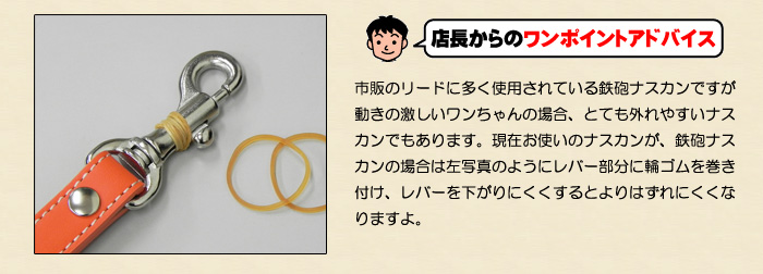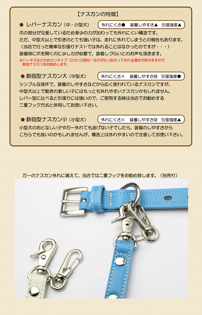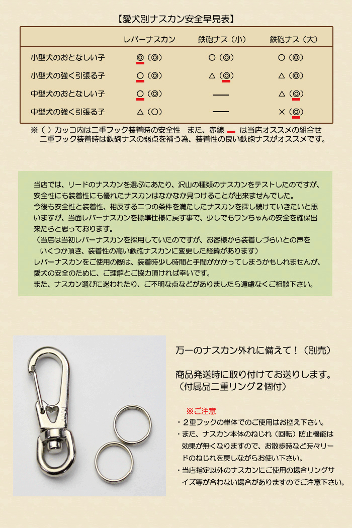 | 付属品・・・カラビナタイプの金具 全長 42mm・重さ8g 二重リング×2個 万一のナスカン外れ用の二重フックです。 安全の為の特別価格でのご提供の為、 二重フック単品でのお買い上げで代金引換 でのお支払いはご遠慮いただいております。 ※ご注意 2重フックの単体でのご使用はお控え下さい。 また、二重リングに変形などが見られた場合はリングの交換をして下さい。 (万一の外れ防止用ですので単体での強度は十分ではありません) また、ナスカン本体のねじれ(回転)防止機能は効果が無くなりますので、お散歩時など時々リードのねじれを戻しながらお使い下さい。 当店指定以外のナスカンにご使用の場合二重リングサイズ等が合わない場合がありますのでご注意下さい。 |